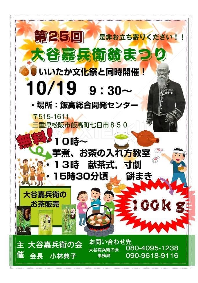 お知らせ 第25回 大谷嘉兵衛翁まつり 2025/10/19㈰ AM9:30~ 場所:飯高総合開発センター 大谷嘉兵衛の会では、飯高町の四季・行事を中心に、広く写真を募集しております。どしどし投稿してください、飯高フォトギャラリーに掲載させていただきます。 大谷嘉兵衛資料館では、大谷嘉兵衛にまつわる資料(写真・書・記載記録)など広く収集活動を行っています、ご協力いただければ幸いです。 IITAKA photo gallery 飯高フォトギャリー